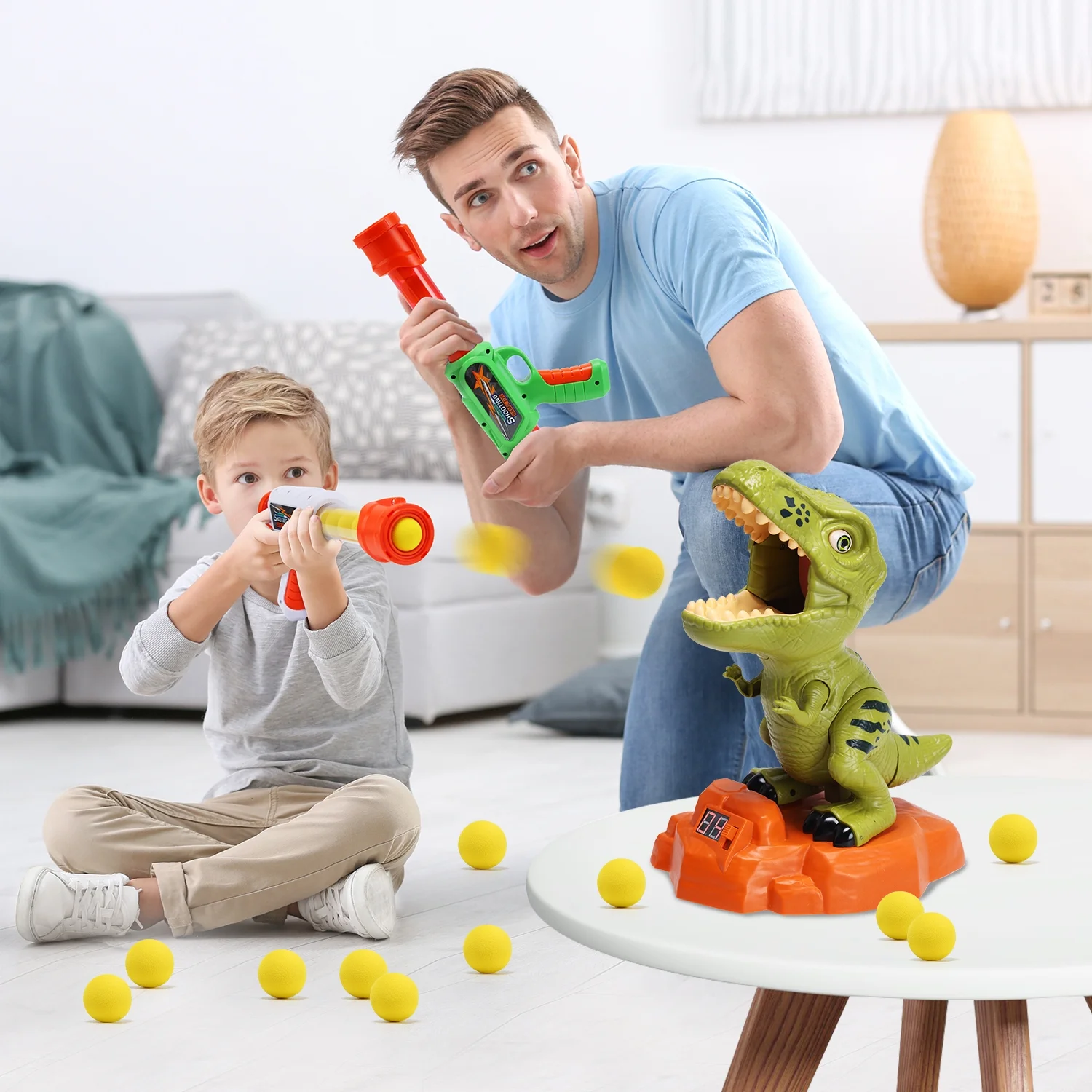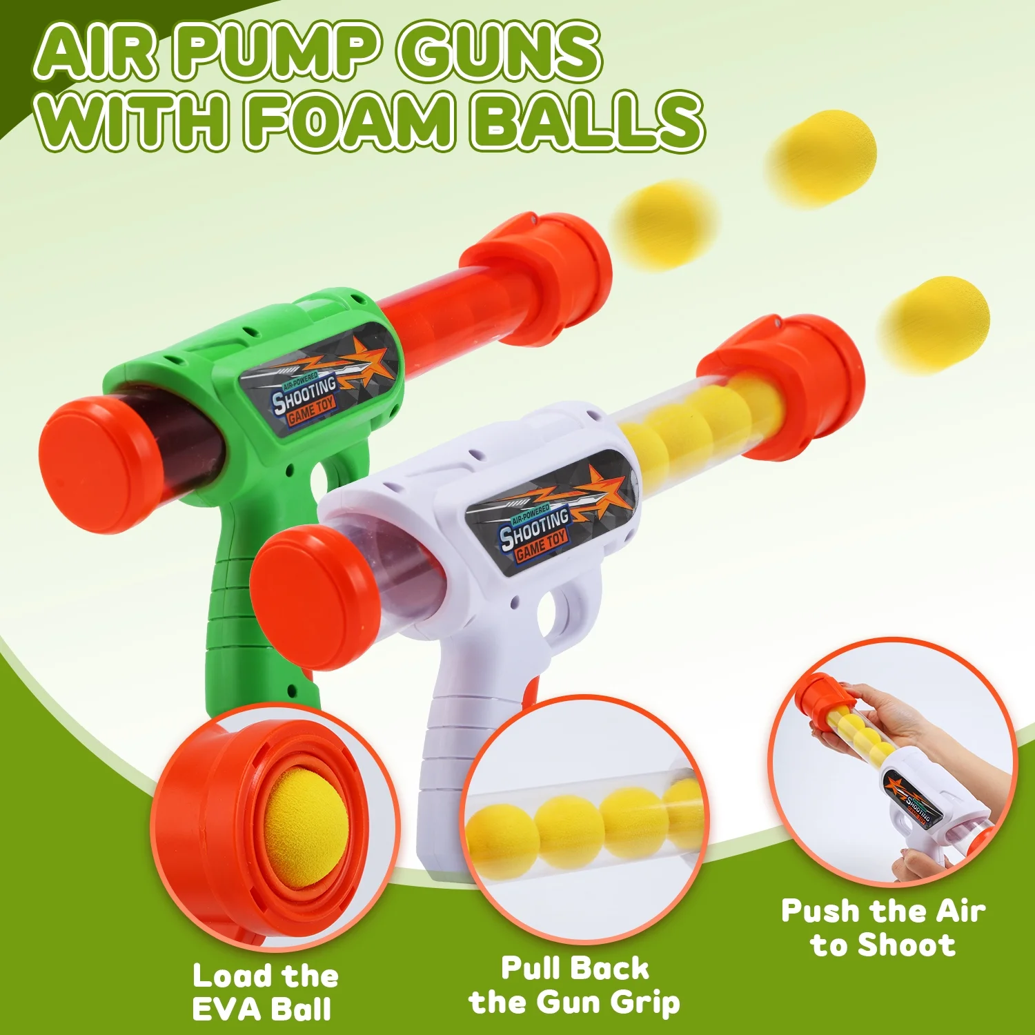 Dinosaur Gun target toys equipped with 1 dinosaur shooting target, 2 air pump guns, 48 rounds of foam bullets.