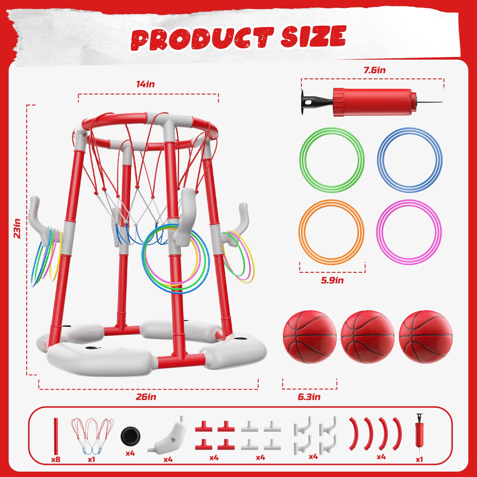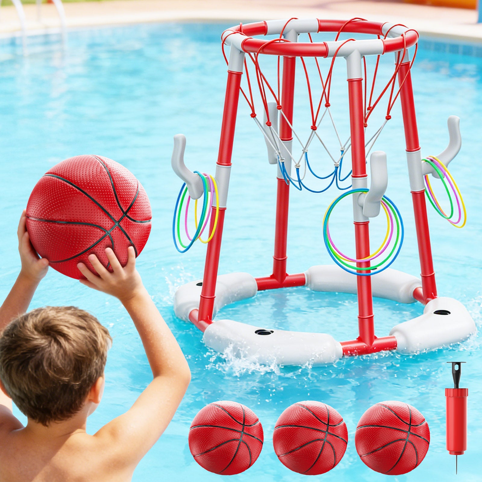 - 【2-IN-1 Pool Basketball Hoop Set】The 2-in-1 Floating Pool Basketball Hoops & Pool Ring Toss Game comes with a basketball hoop, 2 balls, 12 rings(available in 4 colors), and a pump. The ideal summer activity for the whole family! Not only exercise, but also enhance the family atmosphere.