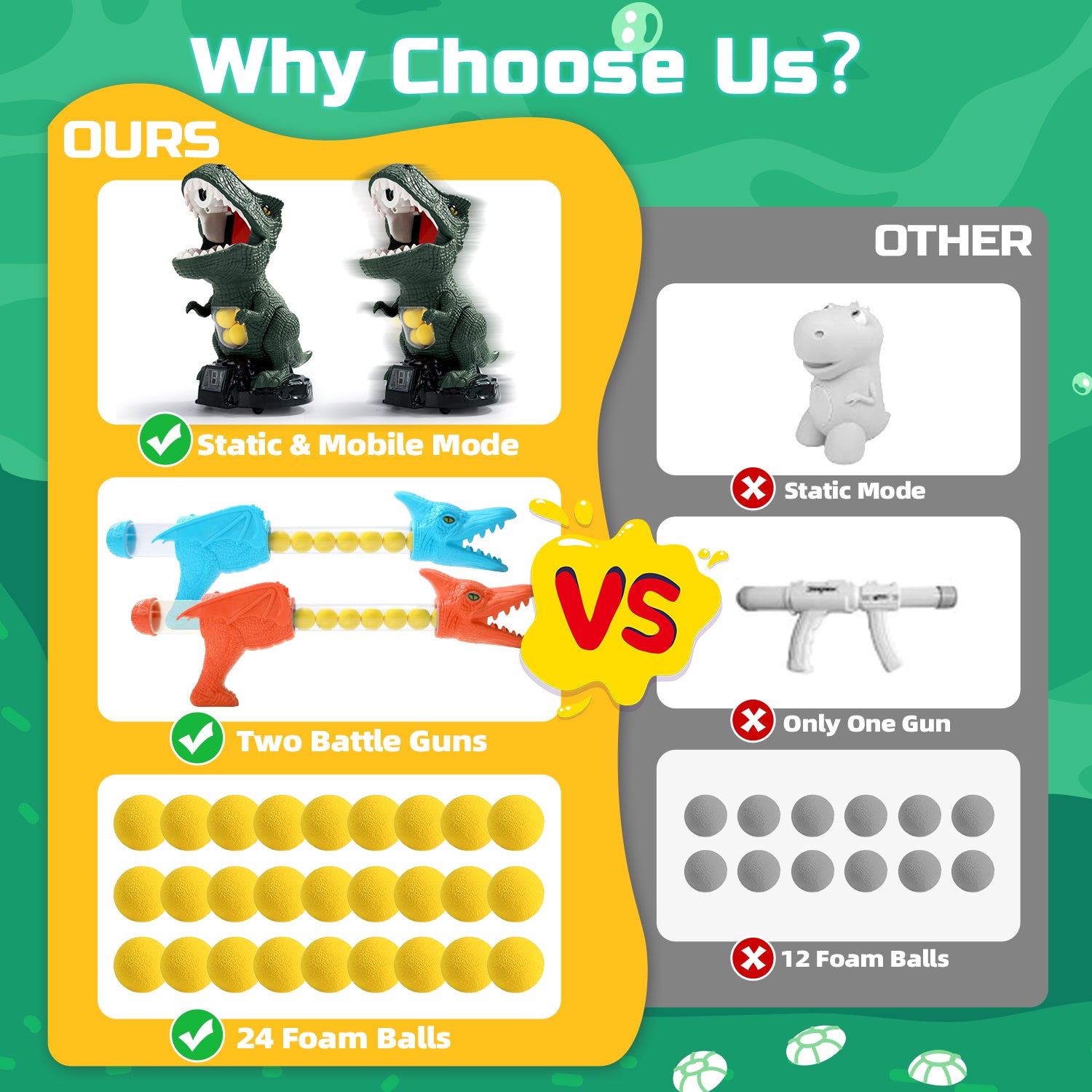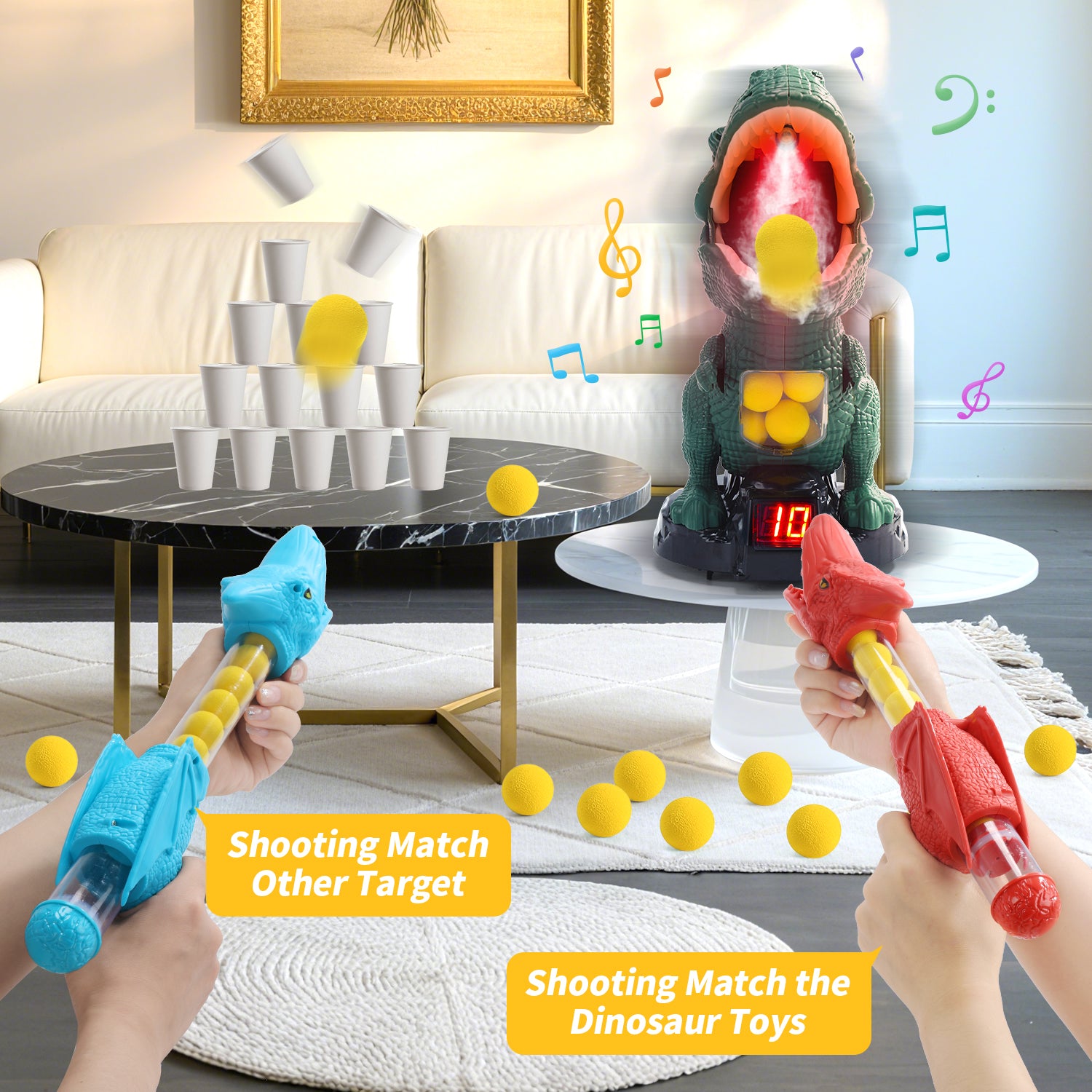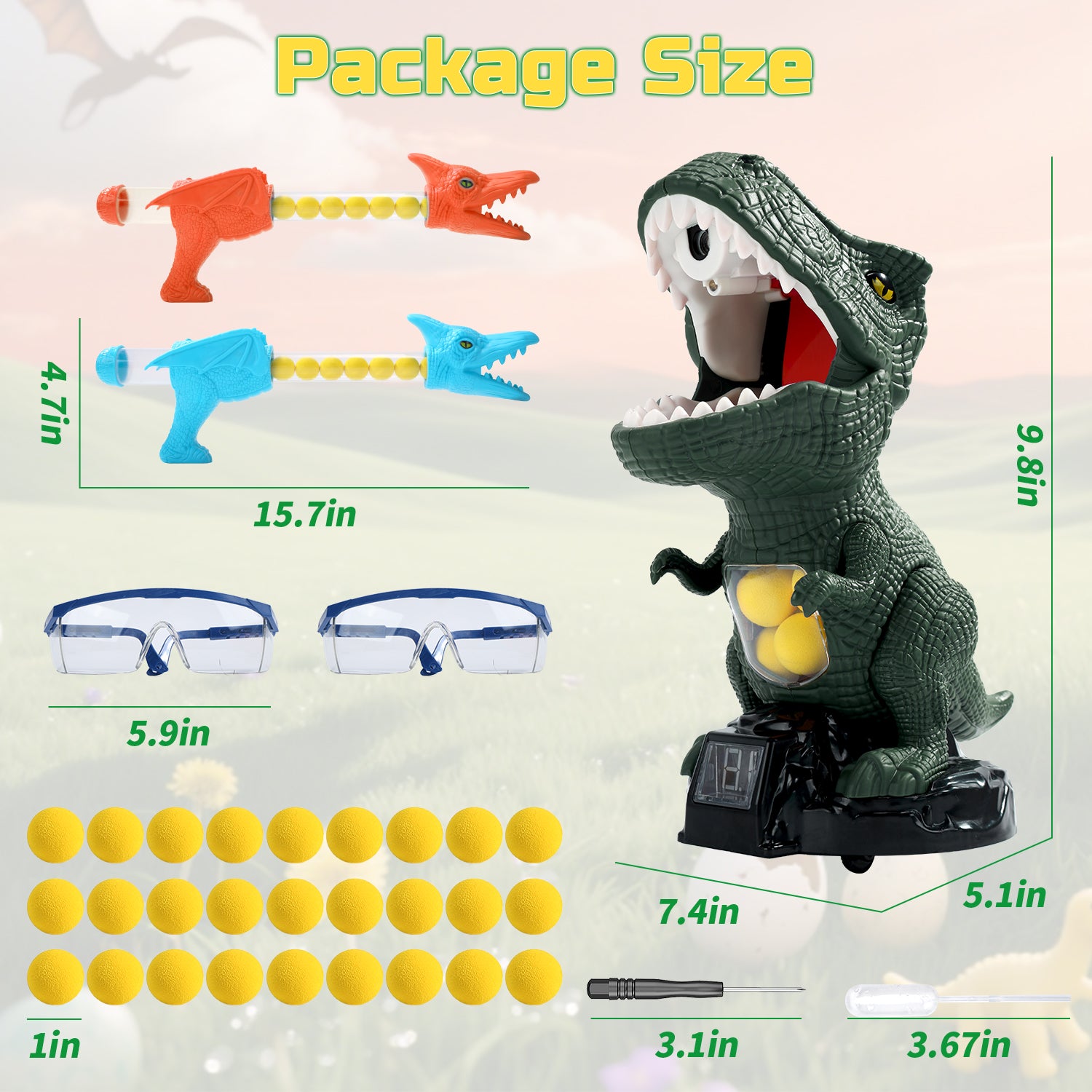 The kit includes 2 pack air blasters, 24 soft foam balls, 1 dinosaur-themed standing shooting target. Whether play independently or as a team against each other, it's flexible enough to meet all your needs. Good choice for indoor & outdoor activities