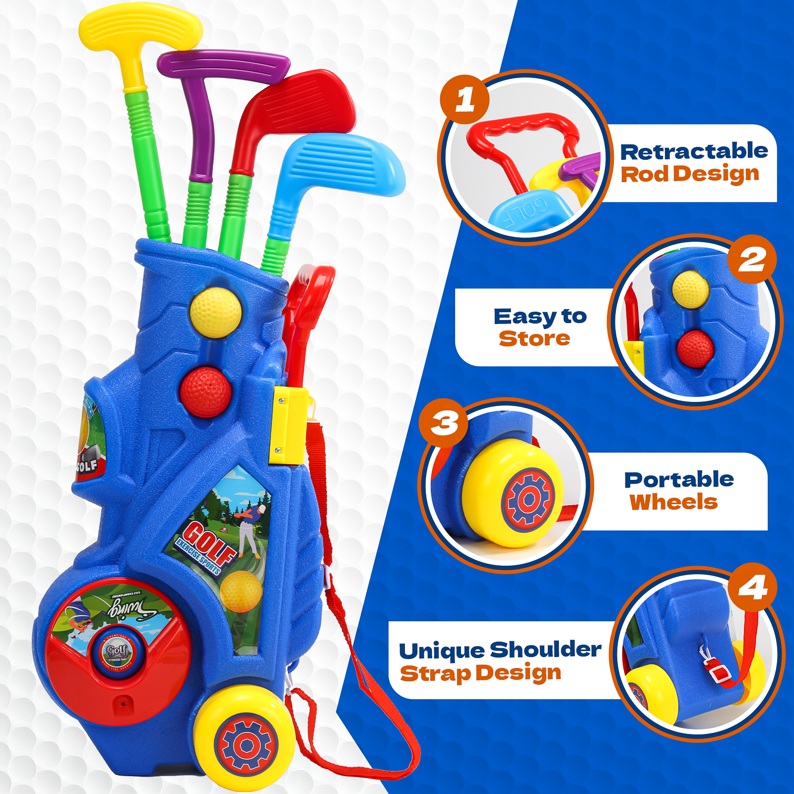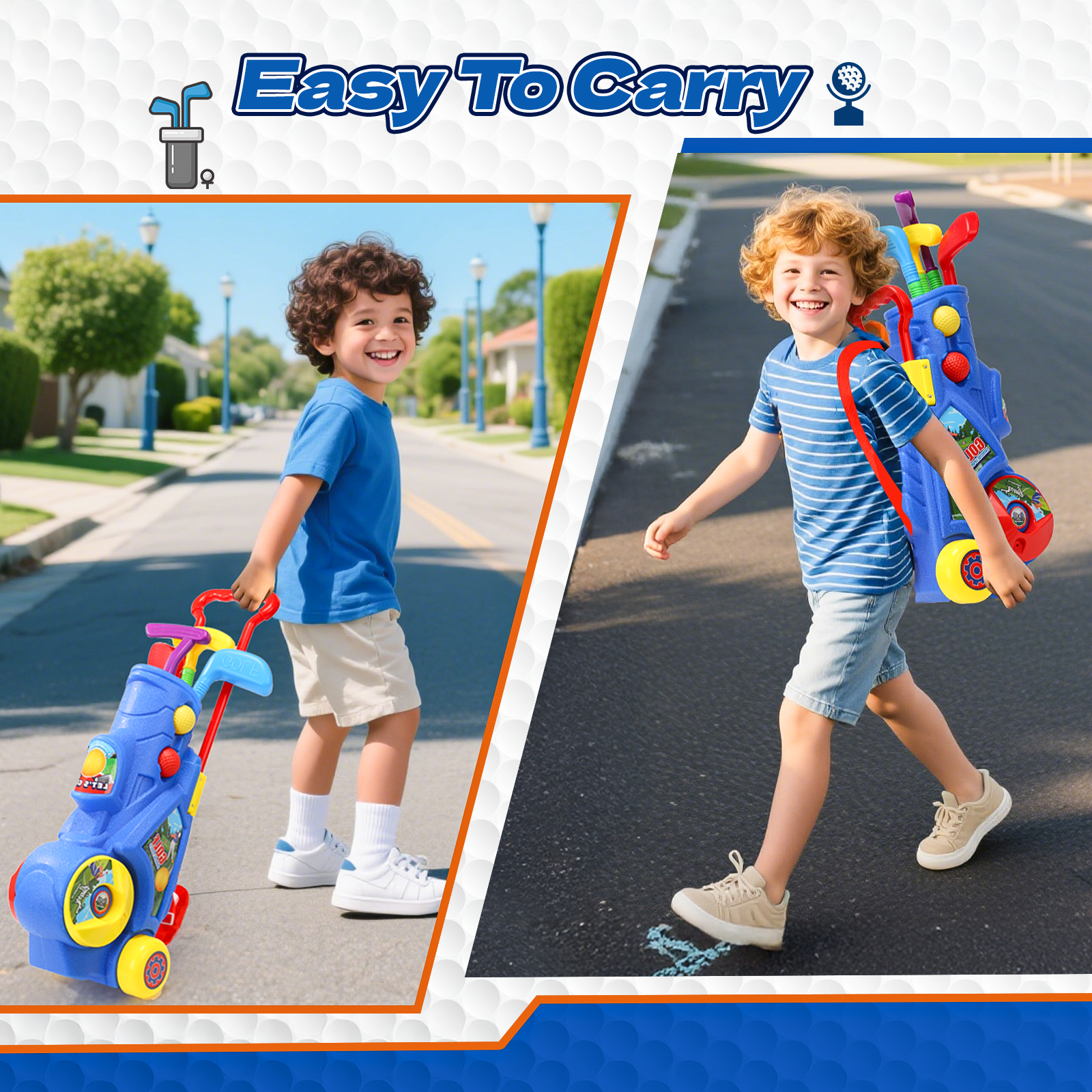 - 【Portable and Well-Designed】Our Kids Golf Cart is Retractable Handle and Flexible Wheels, easy to carry and can keep all accessories. The Golf Clubs Was Enhanced Hardness and No Sharp Edges. Made of Well Plastic Materials, You Could Playing Without Worries.