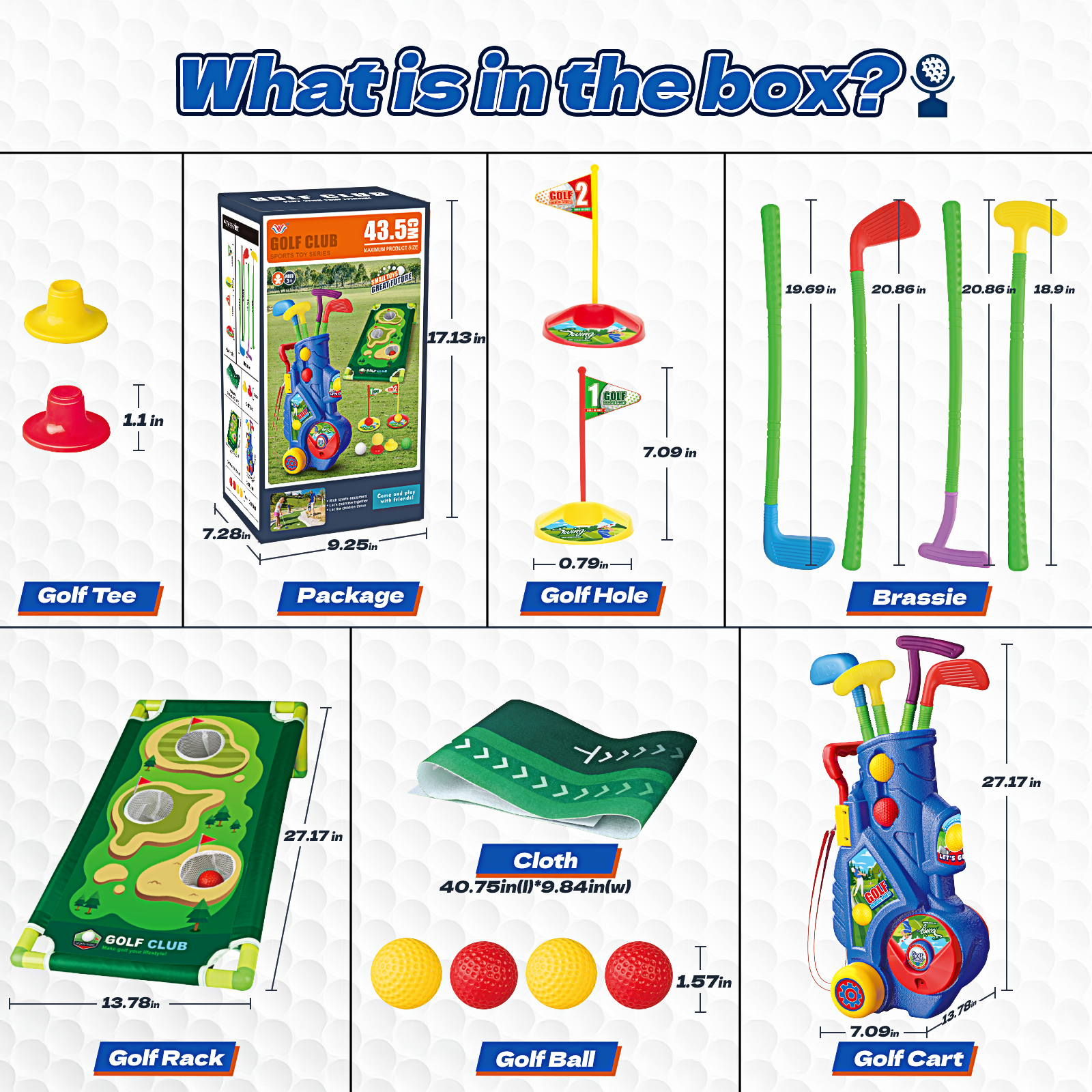 - 【Indoor & Outdoor Golf Toys Set For Kids】JoyStone kids golf set comes includes 1 golf cart with wheels and shoulder strap, 4 golf clubs (putter, sand, iron, and wood), 2 practice holes, 2 flags, 2 golf tees, 4 balls, 1 putting mat and 1 golf cornhole board. Which is designed for 3-6 years old toddlers to get in some golf practice.