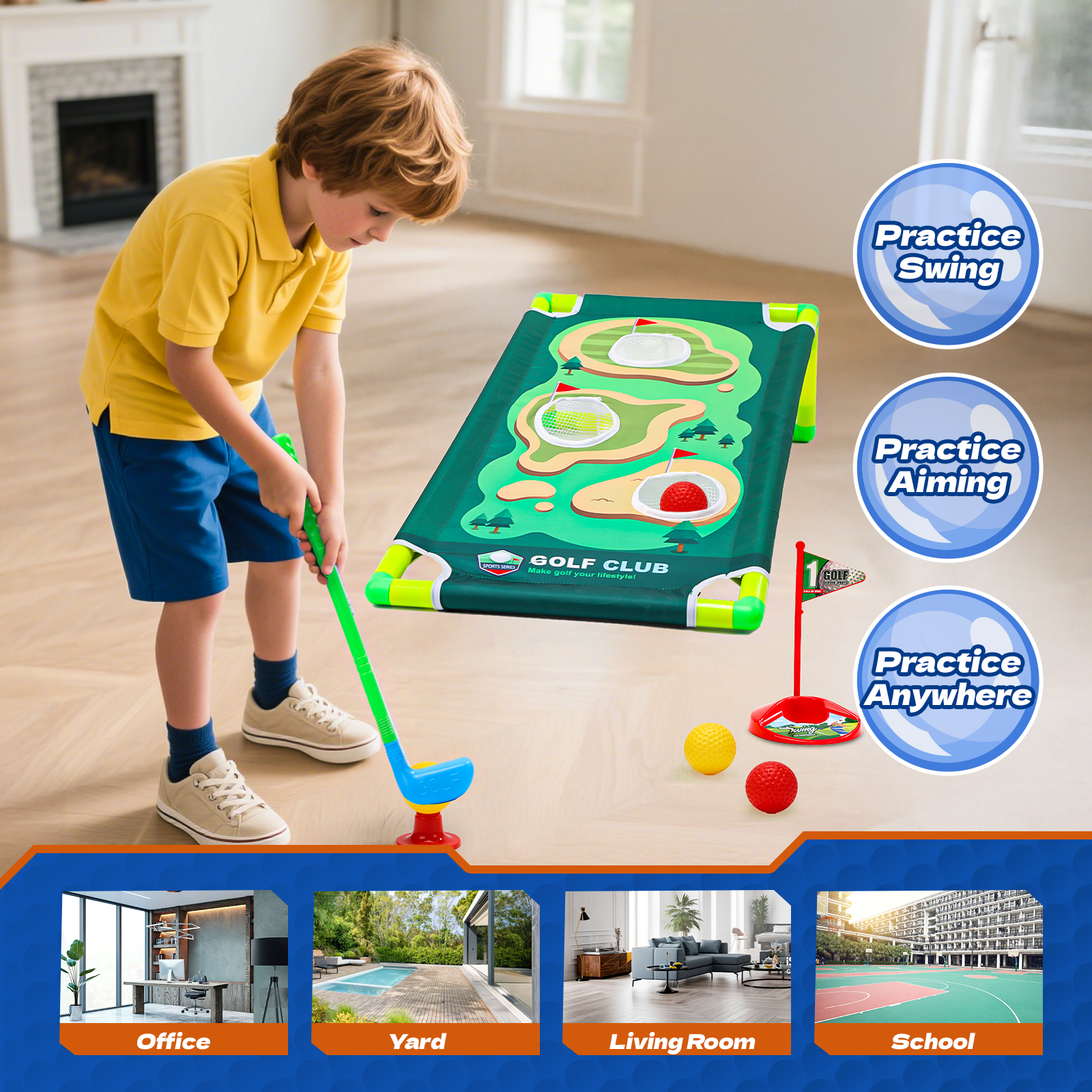 - 【Upgrade Golf Club Set Toy】Compared with other golf toys, we have upgraded this to add a putter pad and golf cornhole board. kids can practice hitting balls according to different length tracks of the mat and learn golf skills better. The golf cornhole board offers a unique way to practice shots and aim, enjoy 2 ways to play!