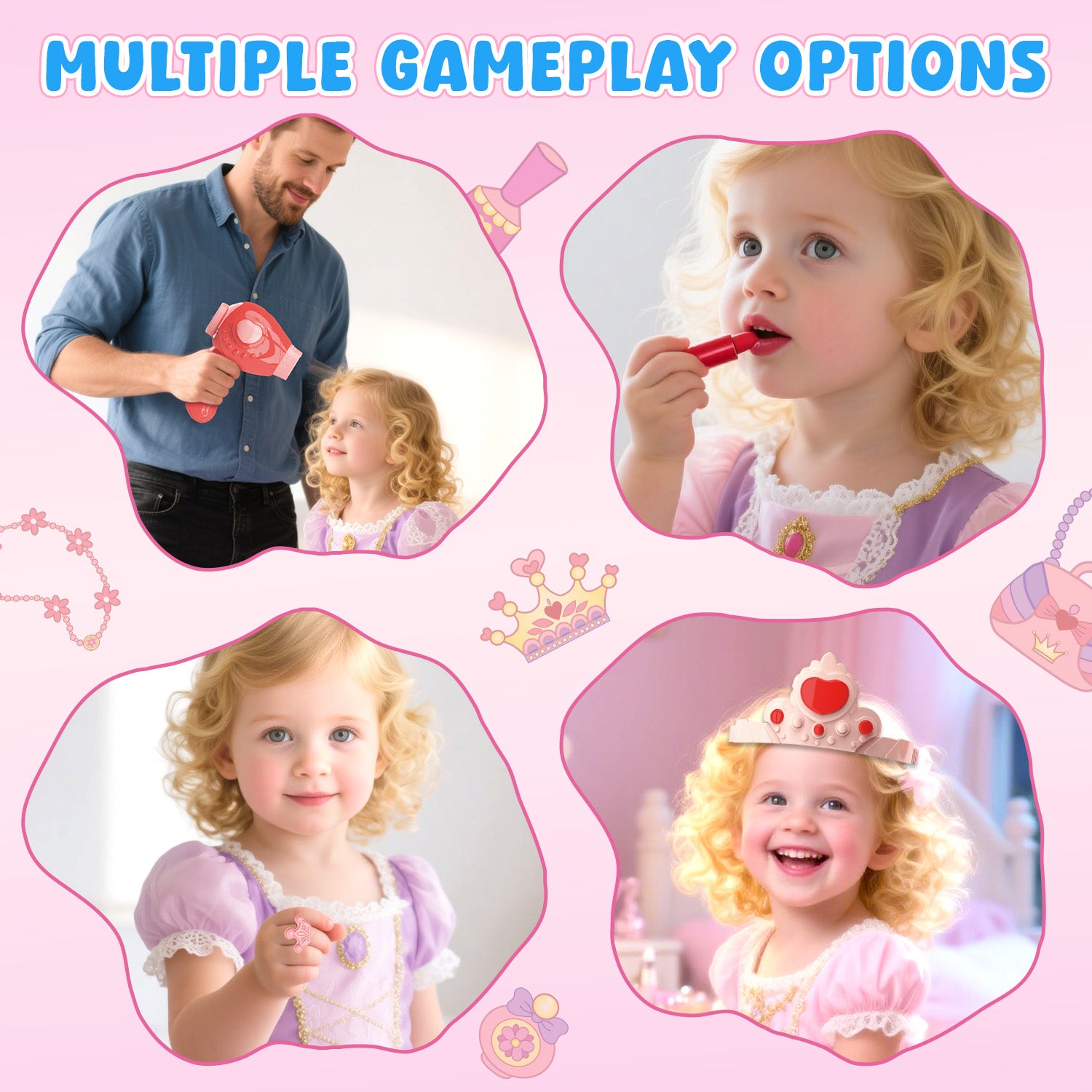 - 【2 in 1 Pretend Makeup】Cute vanity set for little girls comes with tons of colorful pretend play toys including hair dryer toy, rings, lipsticks, necklace, hairpins, etc. The sound and light around the mirror add the entertainment. Meet all the needs of your little princess to have a happy pretend play time without the mess.