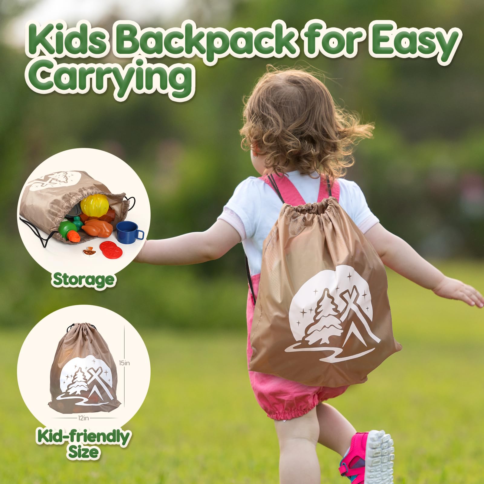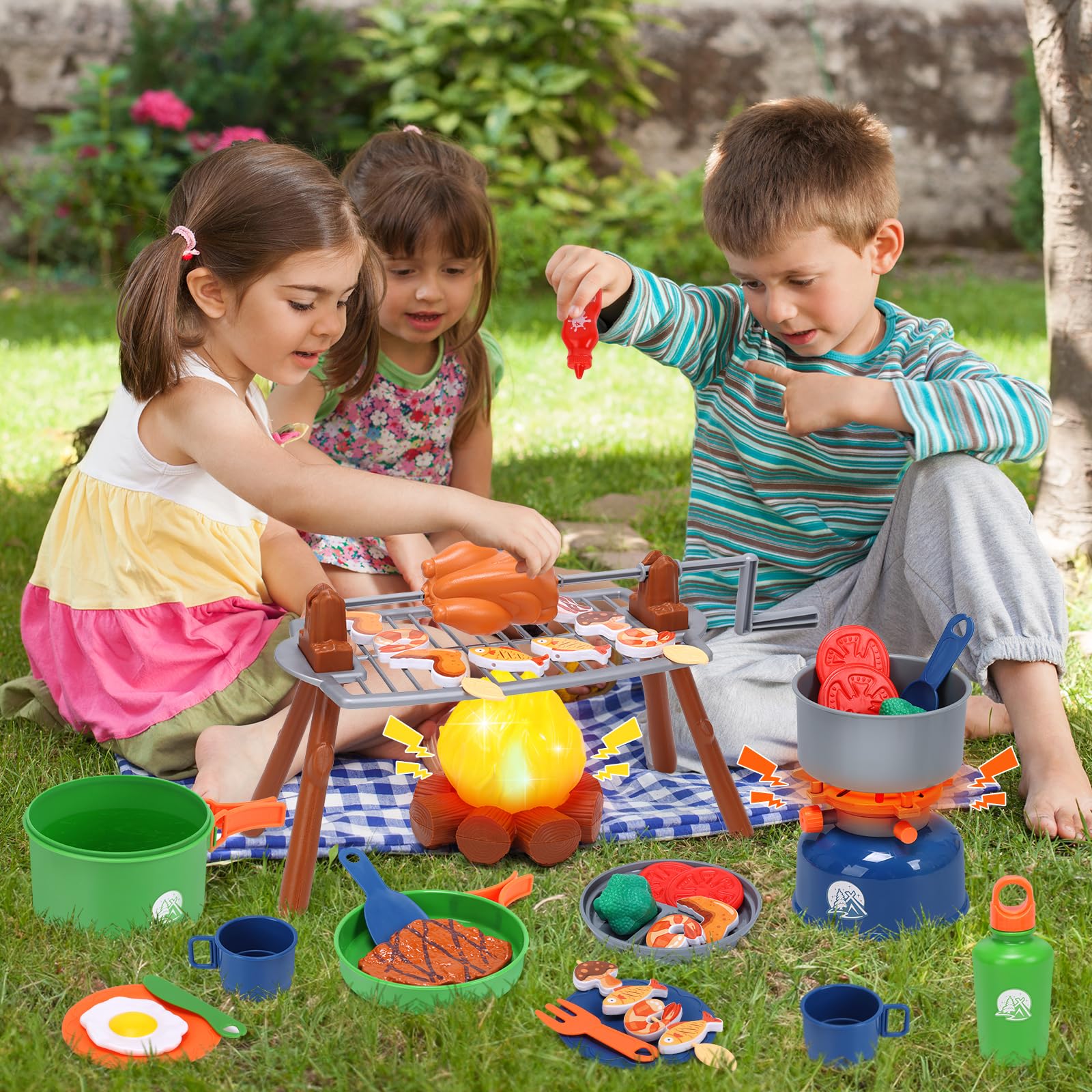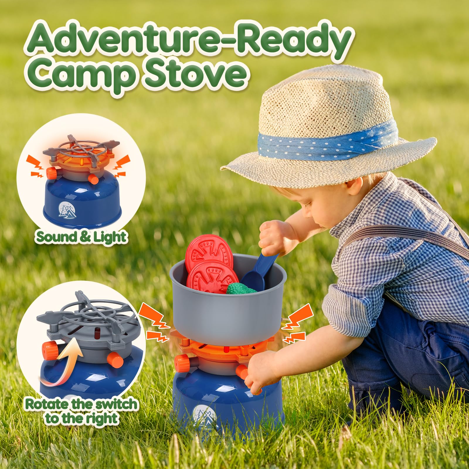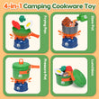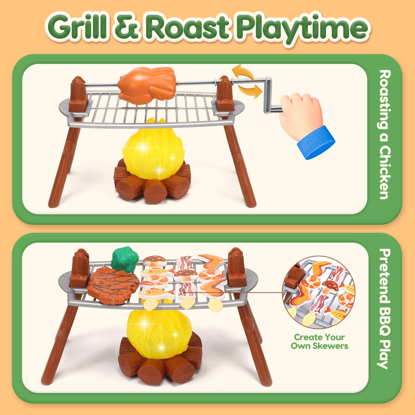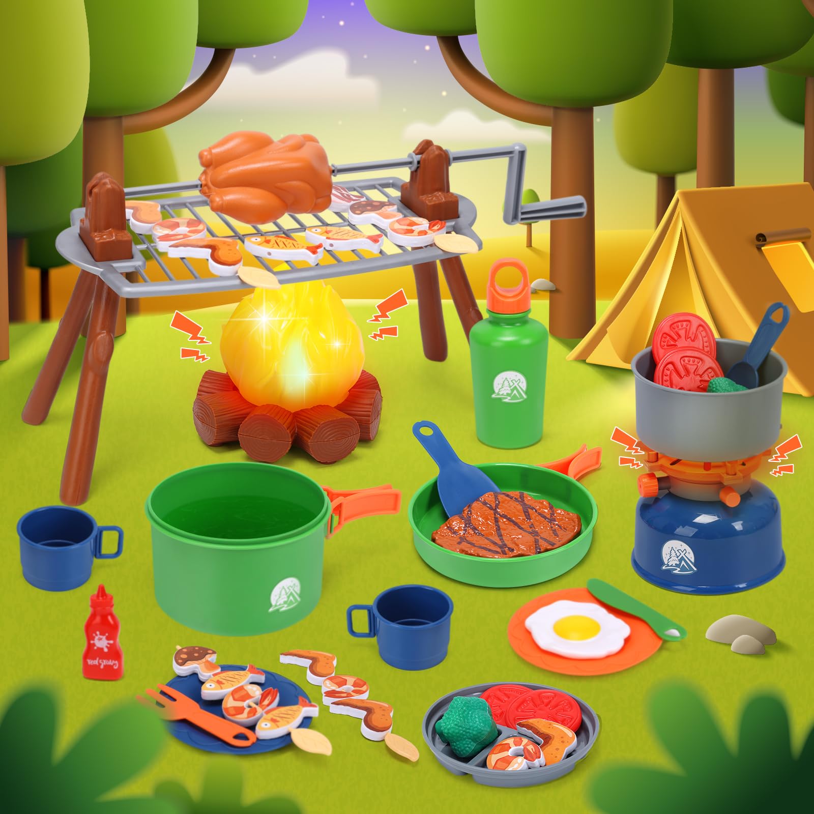 Kids Camping Playset with Light & Sound, 4-in-1 Campfire Toy Kitchen Set with BBQ Grill, Cooking Tools, Play Food & Storage Bag, Outdoor Pretend Play Gift for Kids