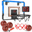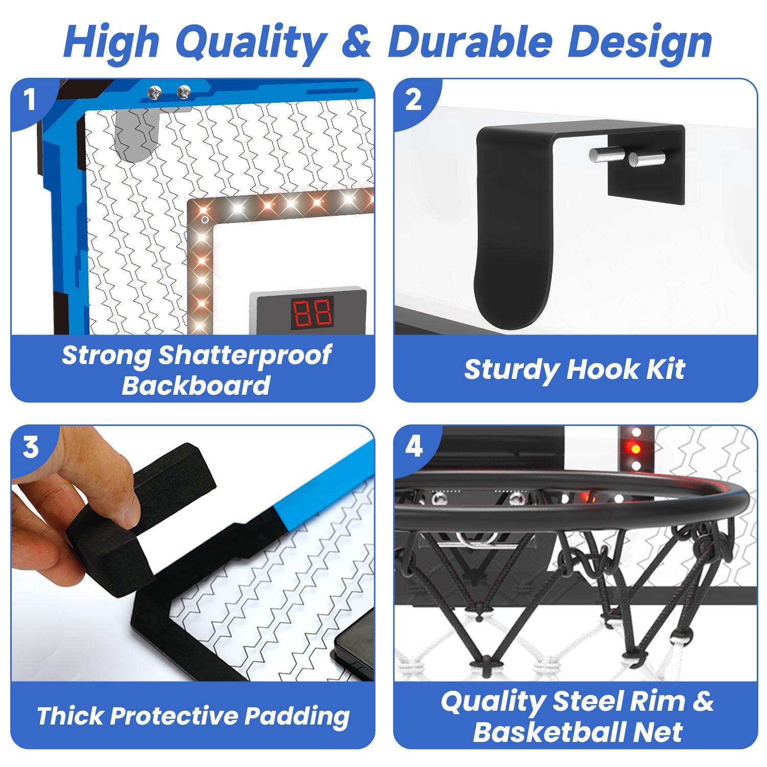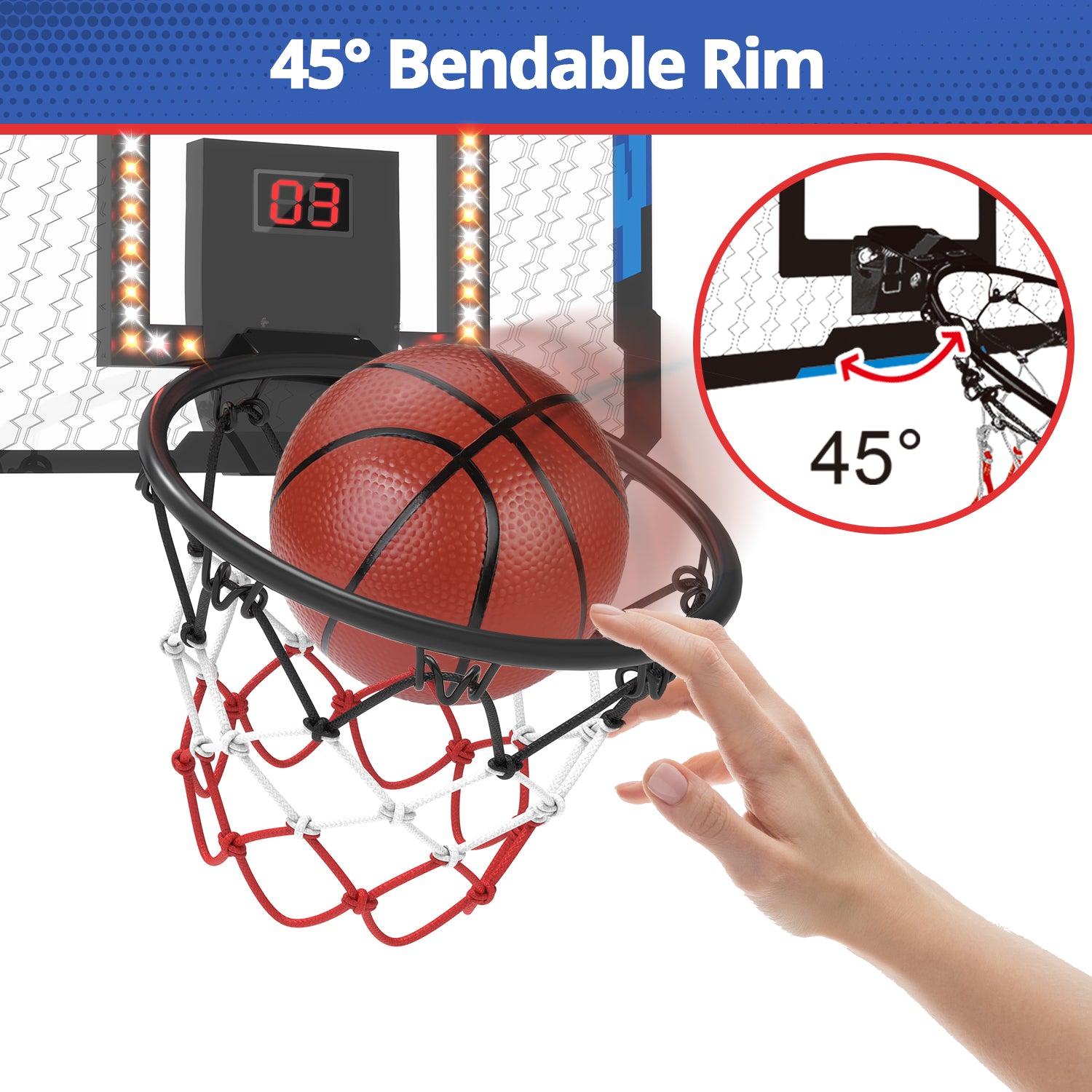 - 【2 GAME MODES for FUN】Our indoor basketball hoop offers 2 game modes for kids to choose from: ① 60-second countdown ② 5-second countdown. These modes add more fun and help develop kids' interest in basketball. Progress through the levels and compete with your family and friends. Designed with break-away rim with spring load, the maximum angle is up to 45°, which stimulates the real feeling of playing basketball. High quality steel rim make it strong enough to stand up to the most powerful dunks without bending or breaking.