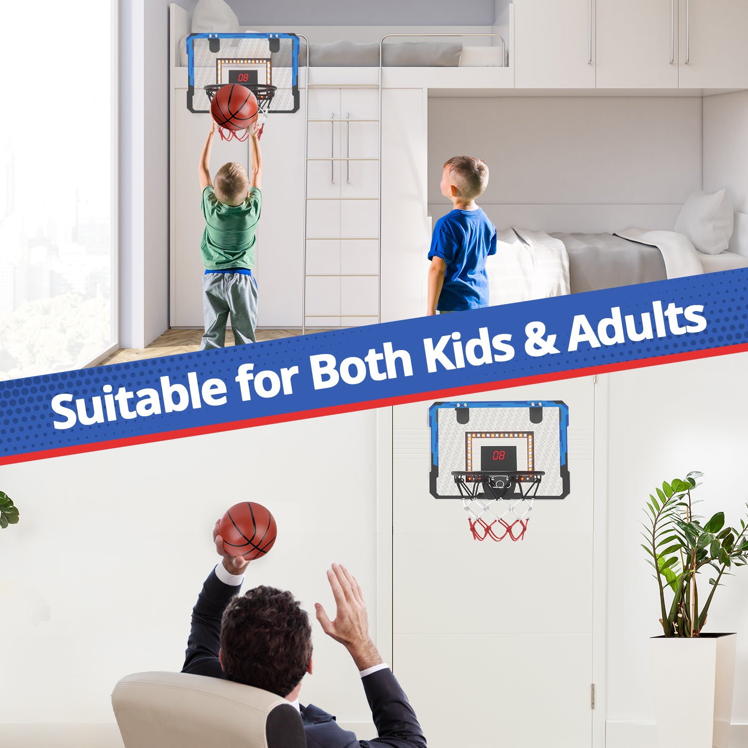 - 【IDEAL GIFT FOR KIDS & ADULTS】Basketball game is a blast to play indoor for toddlers, a good basketball toy can develop their interest in sports and let them say goodbye to video games and TV dramas. A shooting game can also be a great way to relax when working. As bedroom basketball hoop and office basketball hoop, it will be an excellent gifts for game room decor.