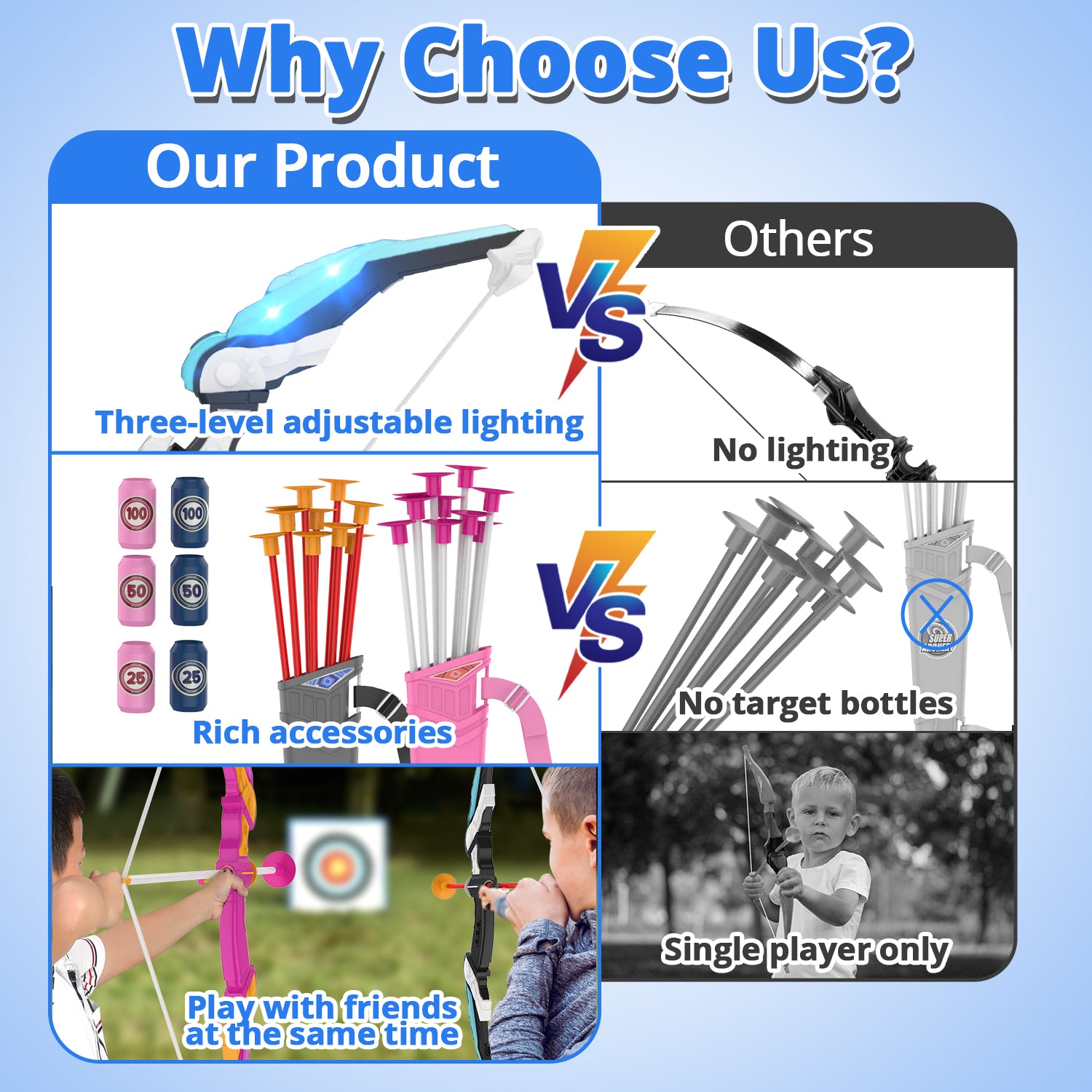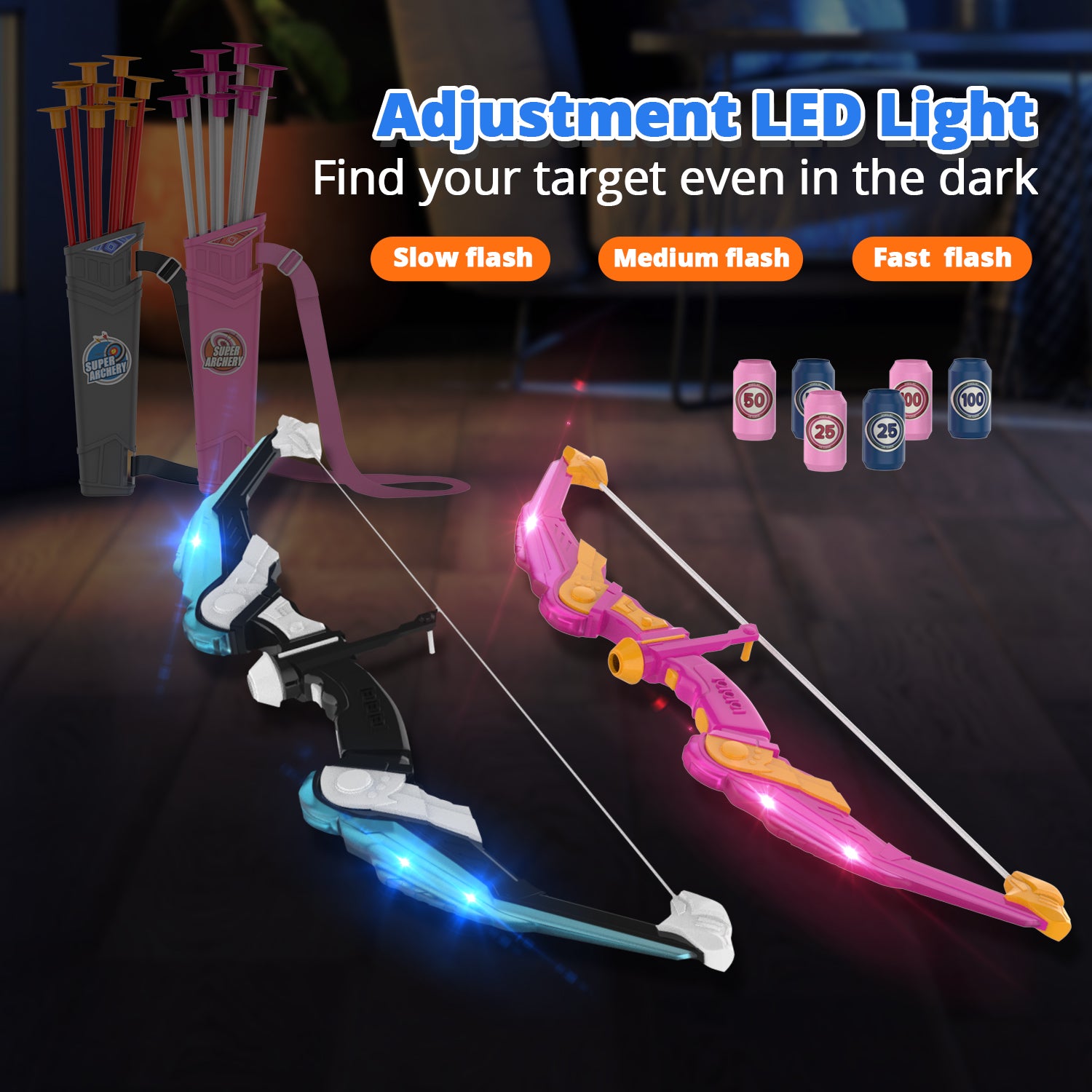 - 【LED Cool Lights】The archery set with LED lights is perfect for you and your children for indoor activities or outdoor games. The light has three levels: fast flash, medium flash, and slow flash. You can adjust the cool effect you want through the switch button. After inserting 2 AA batteries (not included), press the button to turn on the LED light for easy operation, allowing children to easily track arrows at night and enjoy exciting shooting games.