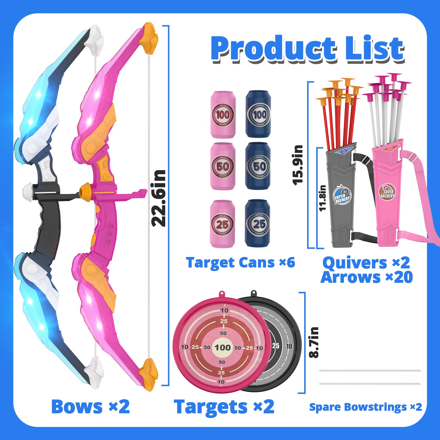 - 【Easy to Store and Carry】Our kids' bow and arrow set contains 2 bows, 20 arrows, 2 quivers, 2 targets, and 6 target bottles. Its suitable size and lightweight material make it easy to carry and transport. Whether you're planning a trip to the park, a camping adventure, or enjoying a family outing, these archery sets are the ideal companion. Encourage your young archer to explore new environments and discover the joy of archery wherever they go.